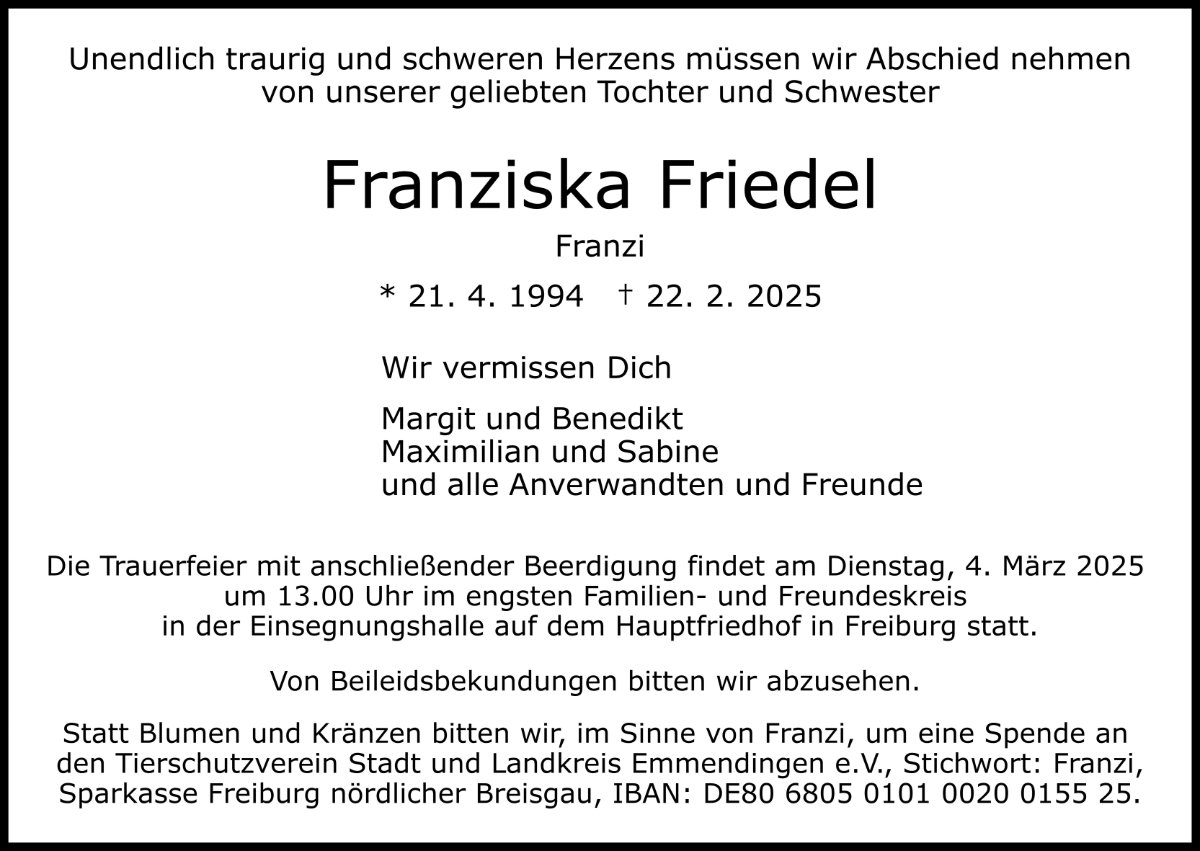 Gleichzeitig wünsche ich euch, dass die schönen Erinnerungen an eure Franzi irgendwann die Traurigkeit ablösen wird. In eurem Herzen wird sie immer weiterleben.