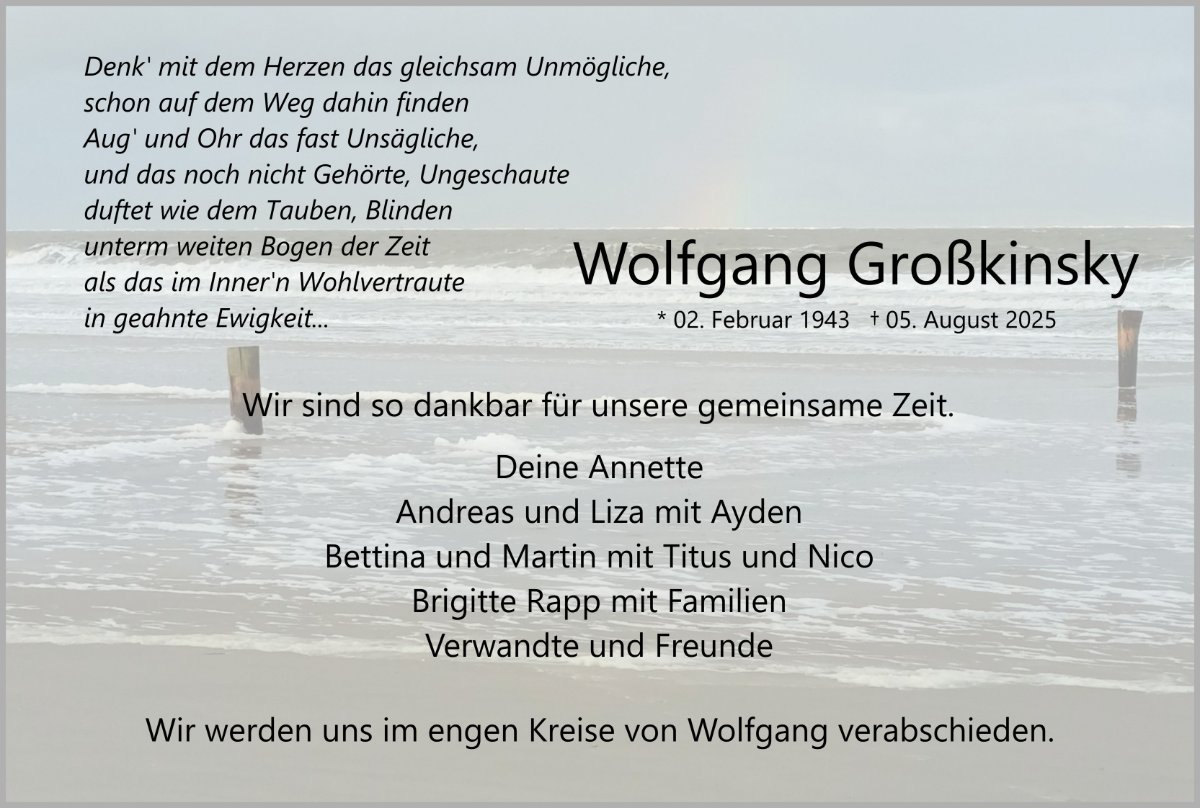 in diesen Tagen fühlen wir mit Ihnen und wünschen Ihnen von Herzen, dass Sie aus den glücklichen Erinnerungen Kraft schöpfen, um positiv in die Zukunft zu gehen. Diese Gedenkseite möge Ihnen dabei helfen, Ihre Trauer zu teilen und das Andenken gemeinsam wachzuhalten.